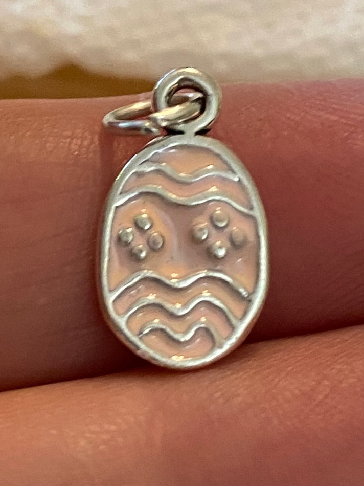Sterling silver Easter Egg charm has a pink enamel inlayed on the front surface. It is 16 mm tall and 11 mm wide. The pink color varies on each charm. see photos.