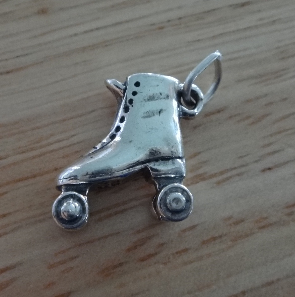 This Heavy solid 3D sterling silver charm is a roller skate with wheels that may move very slightly! It is 17 mm tall and 14 mm wide.