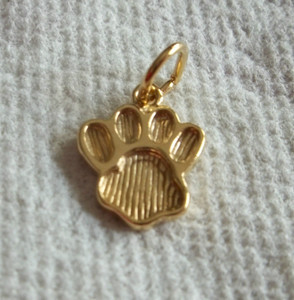 This New sterling silver charm plated with 14K gold is a medium sized paw print. It is 15 mm tall and 12 mm wide.