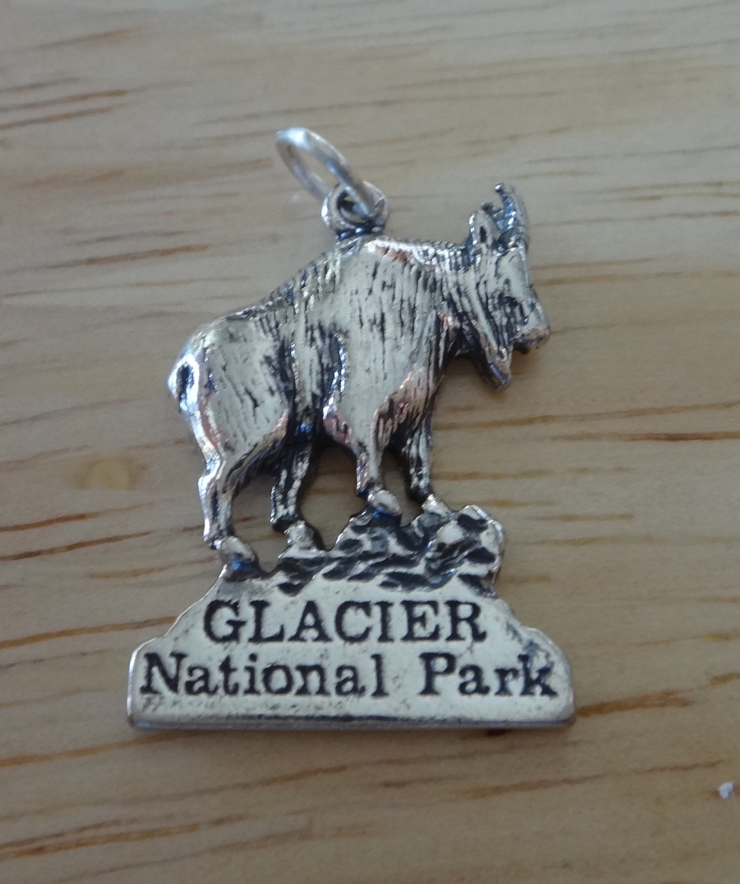 This sterling silver charm is a Mountain Goat and says Glacier National Park. It is 23 mm tall and 15 mm wide. It is concave on the back