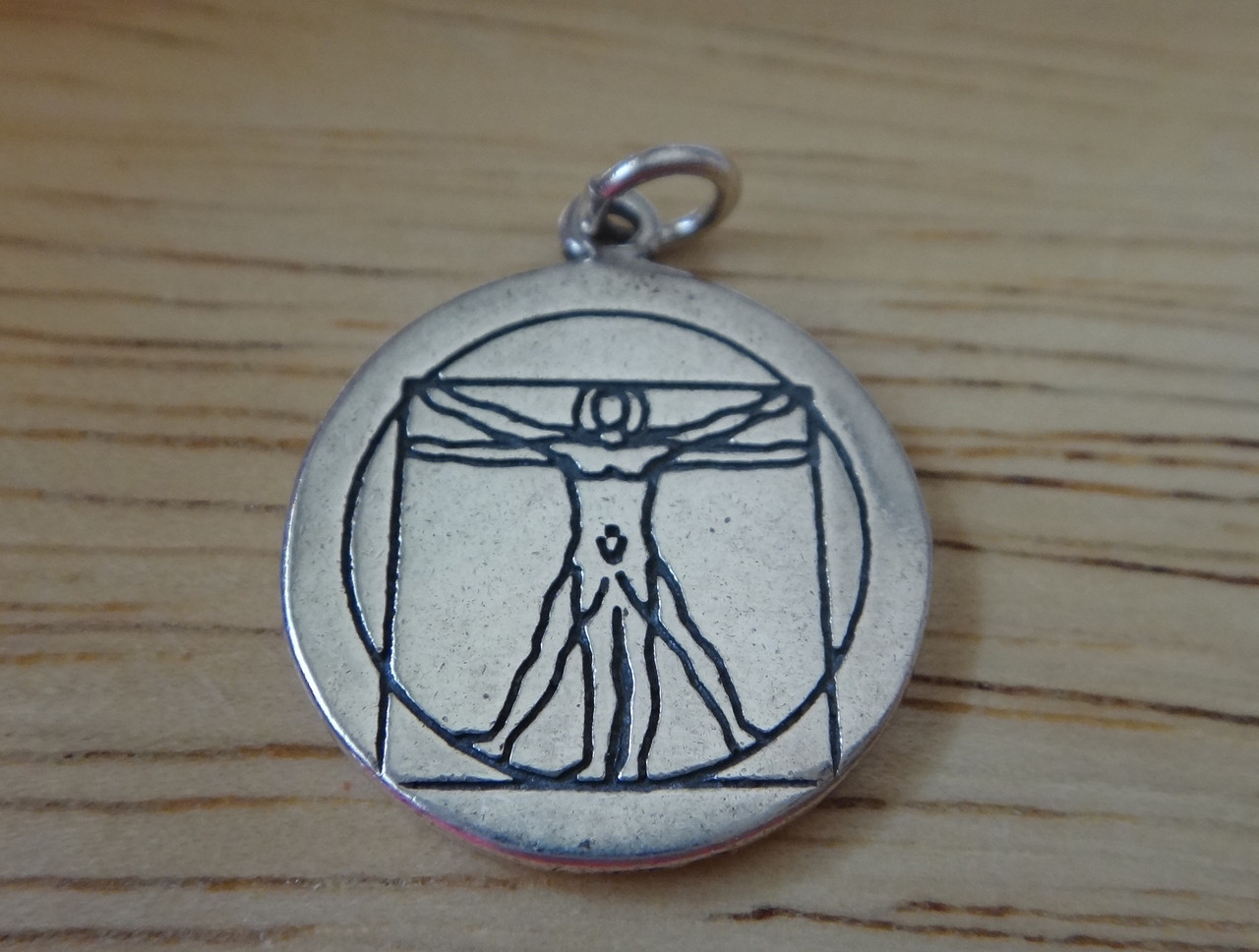 This round sterling silver charm says Vitruvian Man on one side and has the symbol of the drawing on the other. It is 18 mm in diameter. It weighs about 3-4 grams. The Vitruvian Man drawn by Leonardo da Vinci is the human body in a circle and square taken from a passage about geometry and human proportions in Vitruvius' writings.