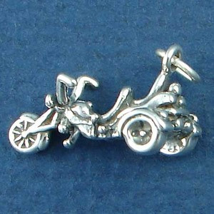 This sterling silver charm is a realistic looking 3 wheel trike chopper motorcycle. It is 1.2 cm wide, 2 cm tall and 1 cm deep! It is fantastic! The photos show different views, but you are buying one.