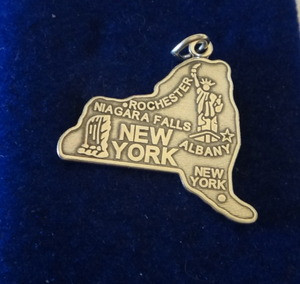 New York measures 2.6 cm wide and 2.4 cm tall. It has the cities of Rochester, Niagra Falls, New York City, and Albany written on it. It says New York across the bottom. It has a picture of the Statue of Liberty and The Falls. The back is marked with 925.