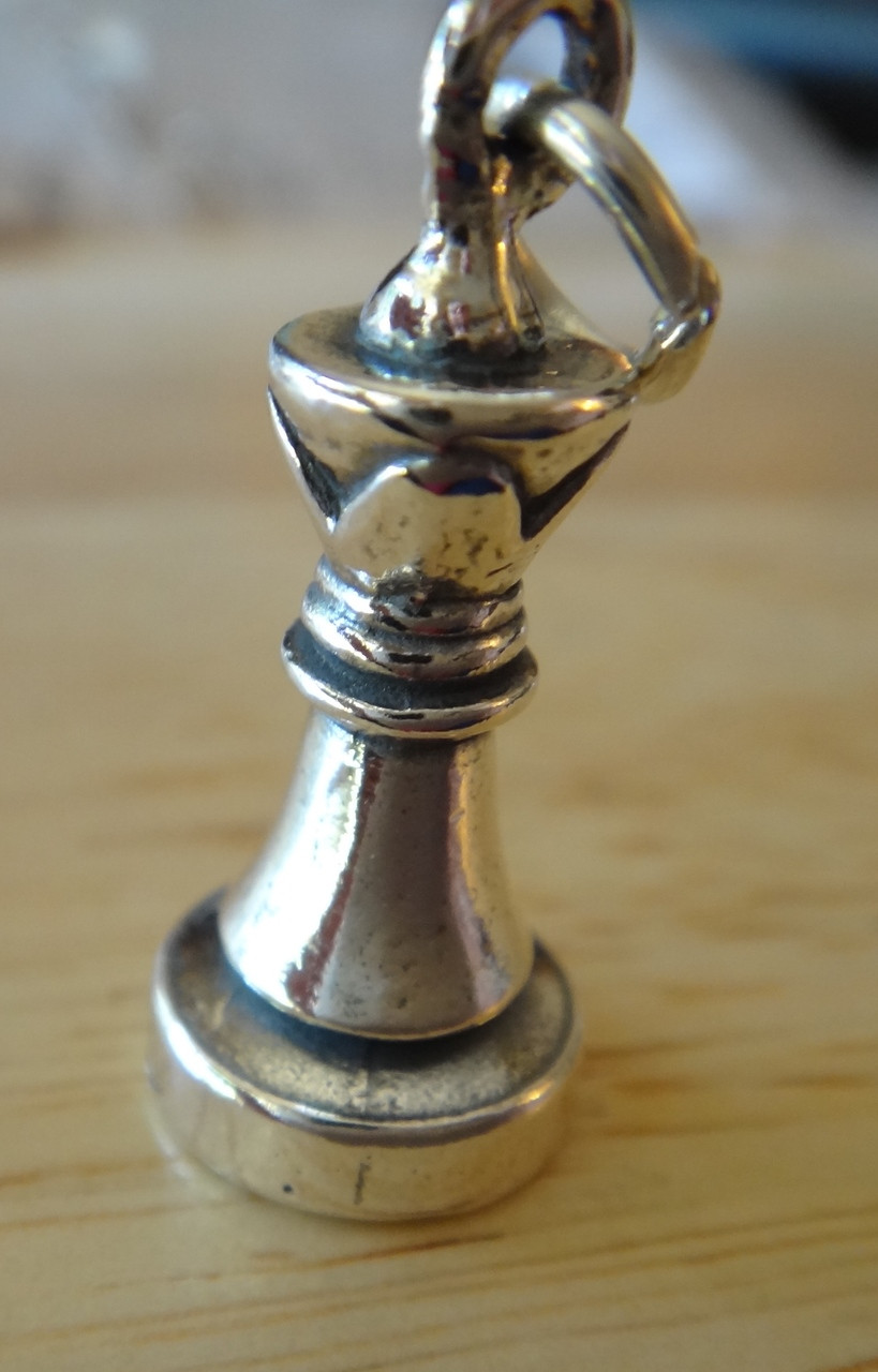 This sterling silver heavy solid queen chess piece charm is 24 mm tall and 10 mm wide. It is very detailed and 3 dimensional. Look also for the rook, knight and pawn chess pieces for sale in my store!