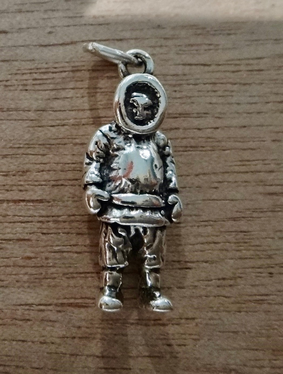 This sterling silver charm is an eskimo or person in a big heavy coat. It is 3 dimensional and solid at 25 mm tall and 10 mm wide. It looks as good on the back as it does on the front.