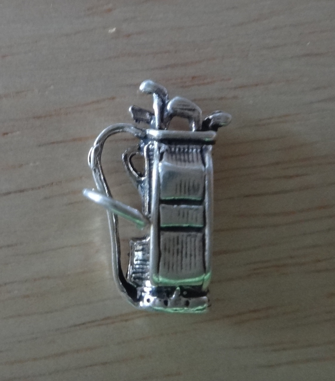 This 3D sterling silver charm is a detailed golf bag with golf clubs! It is 17 mm tall and 10 mm wide.