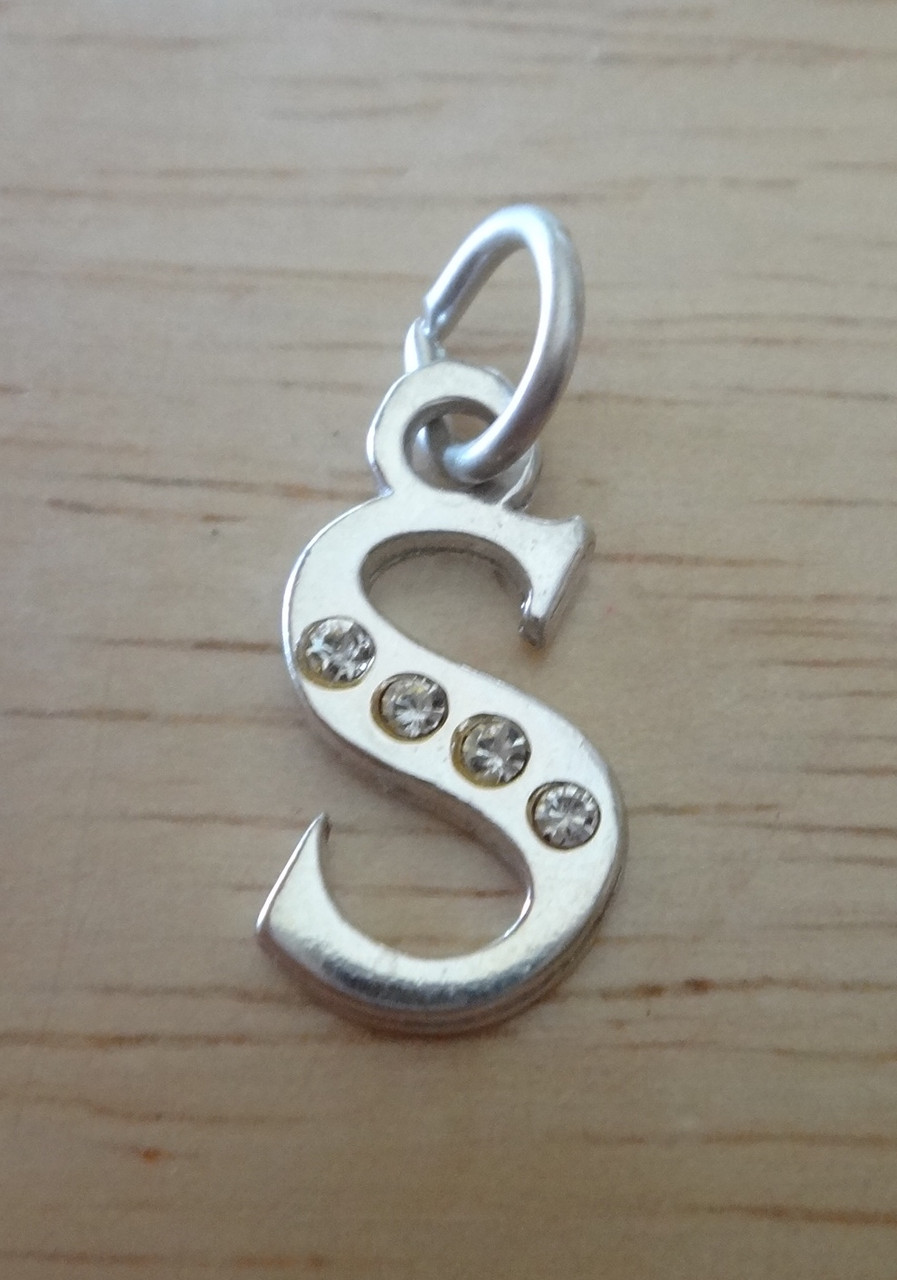 This sterling silver initial S charm decorated with 4 clear crystals. It is about .9 cm wide and 1.7 cm tall without bale. It would be perfect for a chain or necklace!