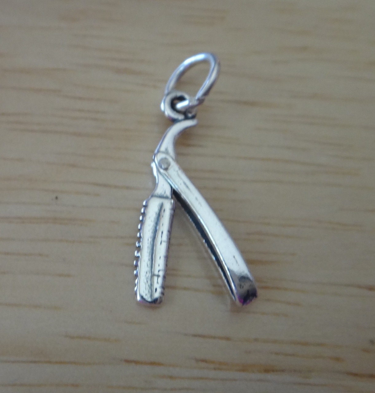 This movable sterling silver charm is a straight razor blade! It looks like the real thing, but is not sharp! It is 22 mm tall and 3 mm wide when closed.