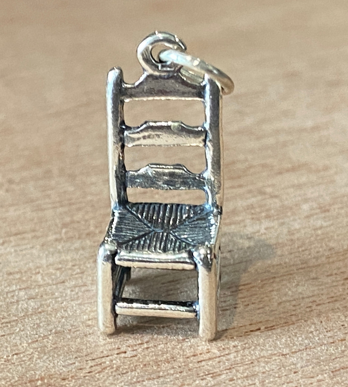 This sterling silver charm is a 3D chair with a ladder back, Shaker style! It is 22 mm tall and 12 mm in wide.