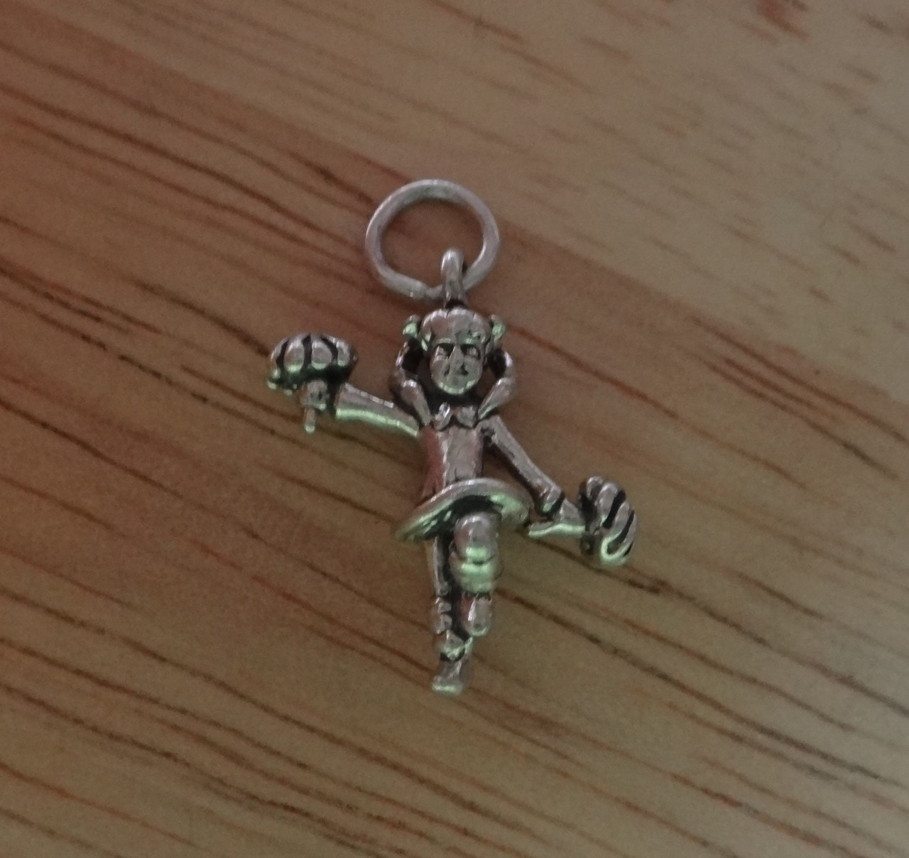 This 3-D sterling silver charm is a young Cheerleader with pom poms. It is 17 mm tall and 17 mm wide. The photo shows the front and the back, but you are buying one.